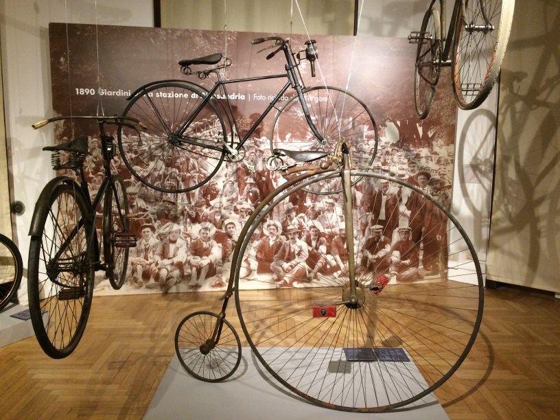Troviamo anche le immagini delle prime competizioni: già il 6 giugno 1869, per la Festa dello Statuto, Alessandria assiste alla sue prima corsa. E se nel dicembre 1885 l’UVI, Unione Velocipedistica Italiana, nasce poco lontano ma in territorio Lombardo, a Pavia, tra le società che la costituiscono c’è anche una realtà alessandrina: il CVA, Circolo Velocipedistico Alessandrino, sorto per volere di Carlo Cavanenghi, il “papà dei ciclisti”. Una sezione museale parla anche di Eliso Rivera, avvocato, nato a Oviglio, fra i fondatori della Gazzetta dello Sport.